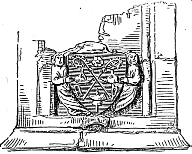 These consist of two Abbots erosiers in saltire, with a stringed hunting horn below the heads of the crosiers on each side and what appears to have been overlooked, possibly from the decaying surface of the stone one also in base. It also displays a rose in the chief middle point, and a mason's mallet, Scoltice, Mell", on the base point of the shield a device for the name of Melrose his initials (A.D) are on the shield, one on each side below the hunting horns and two draped figures of angels and not mermaids as they have been deseribed, carry the shield between them supporting it with their hands on each side the raised wings of the angels being distinctly seen running back on the sides of the sculpture, and something like tho remains of a crown is placed under the point of the shield thus supporting it on the buttress below.